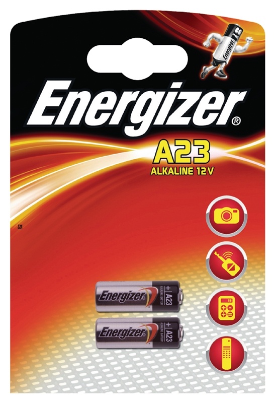 Energizer alkaline battery, model A23, 12 Volt. 2 Batteries in blister pack. Equivalent models: 23A, AG23, E23, E23A, GP23A, K23A, L1028, LRV08, MN21, P23GA, R23A, V23A, V23GA, VR22.